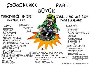 23 Aralik 2001 pazar gunu Kirklareli/Babaeski`de Turkce Rap konser olacaktir.Yer Tugba Hotel Disco. Partide Dj`ligi aRsenik yapacak.Ayrica Partiye katilan gruplar arasindan En iyi Mc grubu secilip ve Trakyanin en iyi b-boy grubu secilecek ve odul verilecek.Katilalan gruplar SunLar: Mc Kanun DELI Mc Barbariþ (Respotrap-Mc Infaz) Kahin Beyazmayin B-MAsta KRE CLAN&THE; VAMPIRES) Lewo Adrianapolis Reaksiyonist Radikal MC Lanetli Duman ? Yargic ve daha bircok supriz isimler vardir. Partide Juri olarak Tunc-Kanun-Deli Mc-Lewo olacak.